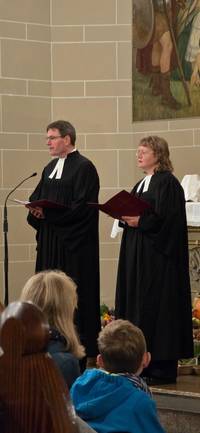 Die Fusion zweier Pfarrgemeinden mit langjähriger eigenständiger Tradition zu einer Gemeinde ist ein großer Schritt. Dekan Dr. Christof Ellsiepen ließ es sich nicht nehmen, gemeinsam mit Pfarrerin Veronika Kurlberg aus den evangelischen Gemeinden im Norden den Festgottesdienst zur erfolgreichen Fusion zu leiten und in seiner Predigt und einer Ansprache der Jakobus-Johannes-Gemeinde Segensworte für die gemeinsame Zukunft mit auf den Weg zu geben.
