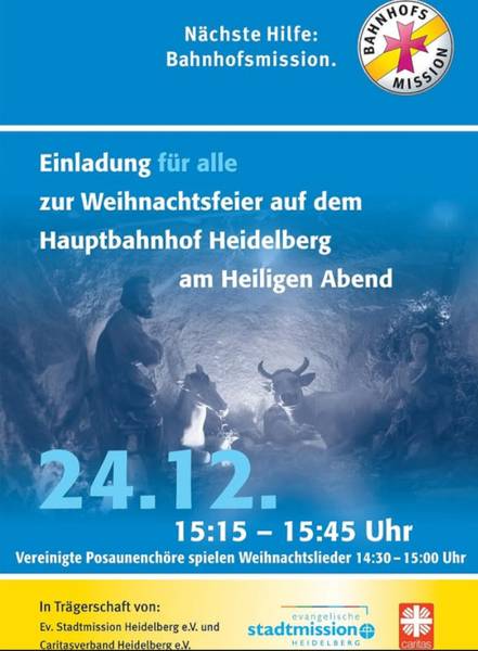 Herzliche Einladung zur Weihnachtsfeier in der Bahnhofshalle im Hauptbahnhof Heidelberg am Heiligen Abend. Am 24.12. von 15.15 bis 15.45 Uhr. Vereinigte Posaunenchöre spielen von 14.30 bis 15 Uhr Weihnachtslieder.