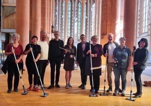 Engagierte aus Kirche, Stadt und Gesellschaft verpassen dem neuen Holzboden in der Heiliggeistkirche den „letzten Schliff“