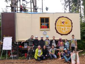 Heidelberg/Michelbuch, August 2021. Schon von Weitem hört man es im Wald der Stiftung Schönau in Michelbuch bei Neckarsteinach hämmern und rufen. Wo sonst eigentlich nur der Wind in den Bäumen rauscht, haben vom 19. bis 28. August wieder rund 60 Jugendliche und junge Erwachsene in bis zu 12 Metern Höhe ein vollständig bewohnbares Baumhaus mit fünf Plattformen über drei Ebenen gezimmert.
