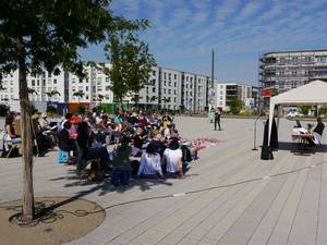 Heidelberg, 30.05.2019. Die Christus-Luther-Markus-Gemeinde lud an Christi Himmelfahrt ein zum Open-Air-Gottesdienst mit Feierabendmahl auf dem Gadamperplatz. Rund 60 große und kleine Gemeindeglieder waren dort bei herrlichem Maiwetter zusammengekommen. Miteinander beteten, sangen und teilten sie mitgebrachte Speisen und Getränke.