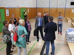 Mehr als drei Stunden dauerte der Besuch von Cornelius-Bundschuh, der bei seinem Rundgang von Dekanin Marlene Schwöbel-Hug und weiteren Kirchenvertretern begleitet wurde. Markus Rothfuß, Leiter der PHV-Projektgruppe, zeigte die unterschiedlichen Stationen, die die Flüchtlinge durchlaufen: vom Wartebereich in der Turnhalle der ehemaligen US-Grundschule, wo die Flüchtlinge ein Vorgespräch mit ihrem Dolmetscher führen, über die einzelnen Schalter, an denen der Flüchtlingsausweis ausgestellt wird, bis hin zum von der Thoraxklinik betriebenen Röntgenabteilung. Seit einer Woche sind die Bundeswehrsoldaten, die hier beim Aufbau des Registrierungszentrums mitgeholfen haben, abgezogen. Rothfuß: „Zum 30. Juni lief die Amtshilfe aus.“