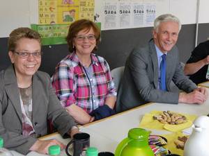 Besonders interessierte sich Cornelius-Bundschuh für die Sozial- und Verfahrensberatung, die von 35 Mitarbeitern von Diakonie und Caritas sowie vom Deutschen Roten Kreuz gestemmt wird. Beratung gibt es hier von 9 bis 17 Uhr – für 300 bis 500 Menschen im Monat, wie Projektleiter Christian Heinze berichtet. 120 Ehrenamtliche sind hier aktiv – organisieren Sprachkurse, Bastelstunden und vieles mehr.