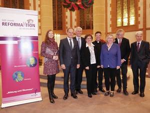 Schuldekanin Beate Großklaus, Oberbürgermeister Eckart Würzner, Landesbischof Jochen Cornelius-Bundschuh, Dekanin Marlene Schwöbel-Hug, Dekan Joachim Dauer, Ministerin Theresia Bauer, Pfarrer Bernd Jäger von der GEKE und EKD Abgesandter Andreas Barner freuen sich über die gelungene Auftaktveranstaltung