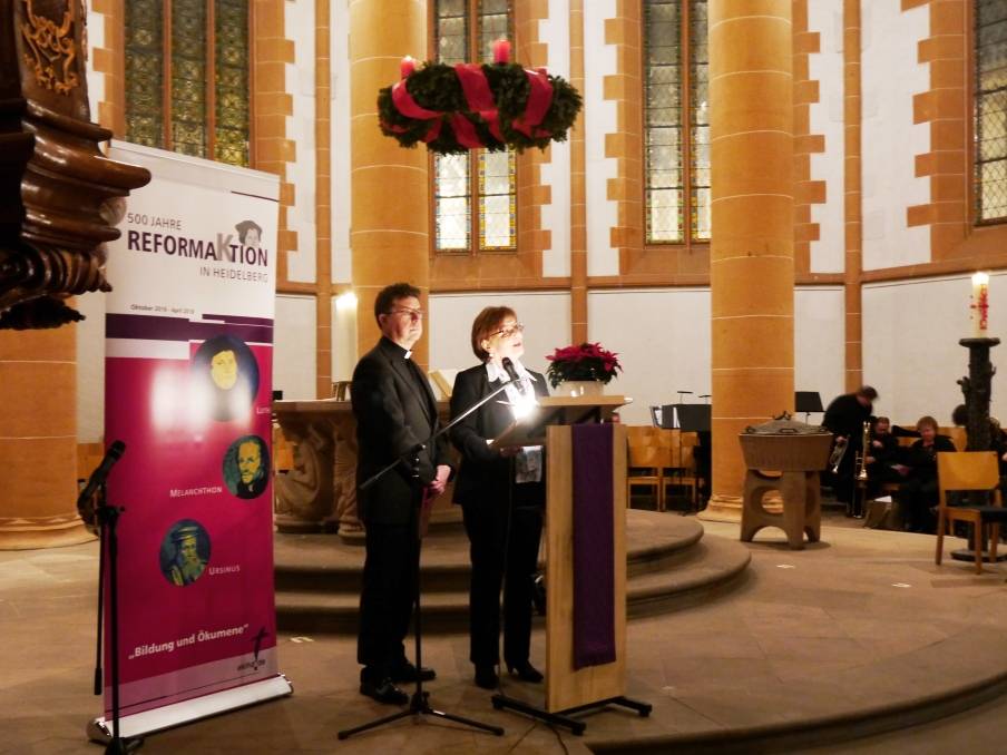 „Wir freuen uns sehr, dass Sie heute hier so zahlreich erschienen sind, um mit uns gemeinsam die Eröffnung unseres Reformationsjubiläums zu feiern!“ Mit diesen Worten begrüßte die evangelische Dekanin Dr. Marlene Schwöbel-Hug gemeinsam mit dem katholischen Dekan Dr. Joachim Dauer die gut 300 Gäste aus Kirche, Politik, Wirtschaft, Wissenschaft und Kultur sowie interessierte Bürgerinnen und Bürger aus Heidelberg und Umgebung. „Unser Motto für dieses Jubiläum lautet `Bildung und Ökumene´. Zur Bildung gehören Werte, die uns das Christentum lehrt, seien wir evangelisch oder katholisch. Zu diesen Werten gehört es auch, dass wir allen Menschen Respekt und Achtung erweisen, unabhängig von Hautfarbe, Sprache, Religion, sozialer Stellung oder Lebensumständen. Beleidigungen von Schwachen und `Fremden´ können wir nicht dulden“, machte die Dekanin deutlich.