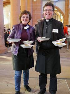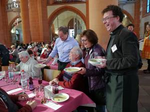 Bedient wurden die Gäste von außergewöhnlichem „Servicepersonal“: Neben Oberbürgermeister Prof. Dr. Eckart Würzner, seinen beiden Amtskollegen Wolfgang Erichson und Dr. Joachim Gerner sowie den Dekanen der beiden Kirchen servierten viele weitere prominente und ehrenamtliche Helfer aus der Stadt und den Gemeinden. „Ich fühle mich wie auf einem großen Familienfest“, beschreibt der Oberbürgermeister die heitere Stimmung in der gefüllten Kirche. „Man fühlt sich wohl und gut aufgehoben, in netter Gesellschaft“, fährt er mit einem Blick auf seine Tischnachbarn fort. Diese sind positiv überrascht von ihrer prominenten Bedienung: „Wann hat man schon mal die Gelegenheit, den Oberbürgermeister persönlich kennenzulernen?“, freut sich ein aus Mannheim angereister Gast. Seine Tischnachbarin aus Leimen ist rundum zufrieden: „Das Essen schmeckt wunderbar und das Schönste daran ist, dass heute einmal wir bedient werden!“