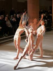 Für die Konstitution der Welt sind für Platon drei Komponenten nötig. Der Demiurg (Gottheit), die Ideen und die Khôra. Viele Philosophen, viele religiöse Schriften haben darüber nachgedacht, was vor der Schöpfung war. Wie sah ein Zwischenzustand aus, war er statisch, schwebend, fließend, sich ständig neu auflösend und dann wieder erscheinend? Platon hat eine fünf Elementen Lehre entwickelt: Feuer, Wasser, Erde, Luft und Äther. Alle fünf Elemente schweben getrennt und gleichzeitig durcheinander, teilweise auch ineinander übergehend durch die Khôra, das Vorseiende. Einem hochphilosophischen Thema haben sich Nanine Linning und ihr Team von Musikern, Licht, Food-, Kostüm- und Bühnendesignern im Tanztheater „Khôra“ gewidmet.
