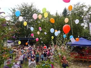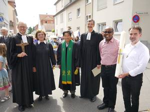 Anschließend zog die Festgemeinde singend durch Kirchheim, vorbei an der katholischen Kirche St. Peter, wo sich die Gottesdienstbesucher in ökumenischer Verbundenheit gemeinsam auf dem Weg zur Arche machten. Dort wurde die Prozession feierlich begrüßt vom Posaunenchor der Bonhoeffer-Gemeinde und der Gottesdienst wurde mit einem Abendmahl beendet.