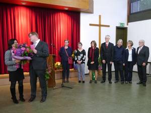 Im Anschluss an den bewegenden Gottesdienst versammelte sich die Festgemeinde im Gemeindehaus zu einem Empfang. Persönlichkeiten aus dem schulischen Umfeld, der Arbeit mit Kindern- und Jugendlichen und der Kommunalpolitik zeichneten unter der Moderation von Kai Neureuther ein buntes Bild von der scheidenden Pfarrerin. Neureuther, Vorsitzender des Ältestenkreises, verglich sie schmunzelnd mit einem „Motor mit Turbolader“. Die Kindergartenkinder sahen sie als „Frau im seltsamen schwarzen Mantel, die trotzdem immer fröhlich ist“. Überhaupt ist es ihr offenes und einnehmendes Lachen, das alle Festredner gemeinsam hervorhoben.„Michaela Deichl zeichnet sich dadurch aus, Menschen in ihrem Umfeld für Ideen und Neues zu begeistern und mitzunehmen“, fasst Neureuther in seinem abschließenden Grußwort zusammen. Er umschreibt die Arbeit der Pfarrerin mit den modernen Schlagworten „nachhaltig“ und „zielstrebig“ und die stets im Vertrauen auf Gottes segnende Begleitung. „Wir verlieren eine Seelsorgerin, die über die Kreuzgemeinde hinaus im Stadtteil präsent wie auch sehr beliebt war – und eine gute Freundin.“