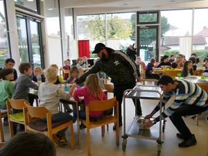 „Mich beeindruckt, wie sorgfältig und liebevoll die Jugendlichen der Graf von Galen-Schule die Jüngeren am Tisch unterstützen“, beobachtet Schuldekanin Beate Großklaus. „Sie decken auf und räumen ab, bieten Nachtisch an und sorgen für Ordnung.“ Ein paar von ihnen kennt sie aus ihrer Schule und freut sich, mit wie viel Ruhe und Selbstbewusstsein sie hier auftreten: „Die bringen echt Augen zum Leuchten.“