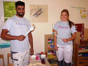 „Zusammen mit unserem Chef Herrn Eck haben wir überlegt, wie wir die Räume neu gestalten können“, erklärt Luisa Engel, die in ihrem zweiten Lehrjahr bei der Firma Eck den Malerberuf erlernt. Gemeinsam mit ihrem Kollegen Abdulsami Daenshjo, der noch im ersten Lehrjahr lernt, hat sie die Farben selbst bestellt, gemischt und an Wänden und Decken aufgebracht. „Insgesamt haben wir eine Woche daran gearbeitet, für uns war das eine tolle Erfahrung“, berichtet Engel begeistert.