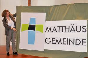 Anschließend fügten Älteste aus beiden Stadtteilen wie ein Puzzle das neue Logo zusammen: ein Kreuz, das sich durch stilisierte Elemente der hiesigen Landschaft ergibt: den blauen Neckar, der von einer grünen Brücke überspannt wird und in dessen Mitte durch Überschneidung die Kirchenfarbe Lila entsteht.