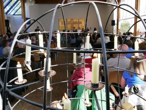 Dieser Gottedienst lag ganz in den Händen der 32 angehenden Konfis, die am 12. und 19. Mai in der Petruskirche konfirmiert werden. In Projekten wie ein Besuch bei der Aidshilfe, Holzarbeiten, der Zusammenarbeit mit Geflüchteten im Café Talk oder Gesprächen mit älteren Gemeindemitgliedern im Pflegeheim konnten die Jugendlichen erleben, wie Gemeindearbeit vor Ort funktioniert. Und dabei intensive Erfahrungen sammeln, was die Gemeinde zusammenhält und den gelebten Glauben ausmacht. Davon berichteten sie ihrer Bonhoeffergemeinde in anschaulichen Präsentationen, die begleitet wurden von musikalischen Einlagen der "Scholako-Band".