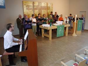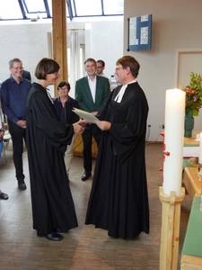 Abschließend gaben Dekan, Schuldekanin und Vertreter des Ältestenkreises der neuen Pfarrerin Gottes Segen mit auf den Weg für ihren Dienst als Seelsorgerin, Verwalterin, Lehrerin und Pfarrerin in der Bonhoeffergemeinde. Fleißige Hände hatten ein reichhaltiges Buffet gezaubert, zu dem beim nachfolgenden Empfang Sekt und andere Getränke gereicht wurden. So gestärkt hieß die Gemeinde ihre neue Pfarrerin mit einem Grußwort des Ältestenkreisvorsitzenden Hans-Georg Pflüger-Heß herzlich in ihrer Mitte willkommen.