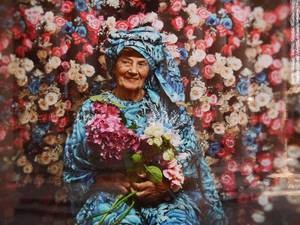 Traudel sieht aus wie eine weise Schamanin. Im blauen Gewand mit lockerem Turban sitzt sie vor einer Wand aus Rosen. In den Händen hält sie langstielige Hortensien. Traudel lächelt. Sie ist 83. Dement. Und wunderschön.