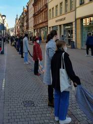 Heidelberg, 13.02.2022. Am vergangenen Sonntag rief das Bündnis "Heidelberg Solidarisch " auf zur Bildung einer Menschenkette als Zeichen der Solidarität und des Zusammenhalts der Gesellschaft während der Pandemiezeiten. Knapp 300 überzeugte Demokratinnen und Demokraten folgten dem Aufruf und bildeten bei herrlichem Frühlingswetter eine Menschenkette, die vom Bismarckplatz entlang der Hauptstraße bis zur Märzgasse reichte und die Aufmerksameit vieler Passanten auf sich zog.