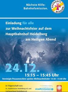 Herzliche Einladung zur Weihnachtsfeier in der Bahnhofshalle im Hauptbahnhof Heidelberg am Heiligen Abend. Am 24.12. von 15.15 bis 15.45 Uhr. Vereinigte Posaunenchöre spielen von 14.30 bis 15 Uhr Weihnachtslieder.
