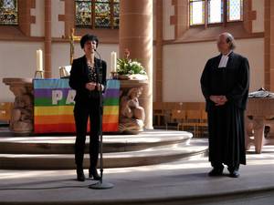 Die Heidelberger Bürgermeisterin für Soziales, Bildung, Familie und Chancengleichheit beantwortete im Nachgang Fragen zur gesellschaftlichen Lage in der Stadt. So bat eine Gottesdienstbesucherin um mehr professionelle Hilfsangebote für Menschen, die durch die Auswirkungen der Corona-Pandemie traumatisiert sind, etwa weil sie sterbende Angehörige nicht begleiten durften oder sich nicht angemessen von ihnen verabschieden konnten. Altstadtpfarrer und Klinikseelsorger Mirko Diepen bestätigte diese Wahrnehmung und bat die Stadt um Kooperationsmöglichkeiten, um mehr Räume zu öffnen für Menschen, die über ihre Ängste und Einsamkeit sprechen möchten.