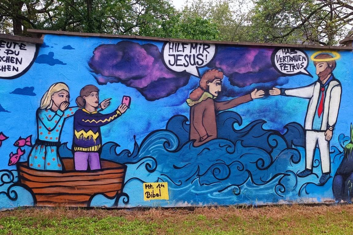 RNZ, 31.05.2022. Von Werner Popanda. Im Park der Kirchheimer Petruskirche ist auf einer 20 Meter langen Mauer ein Kunstwerk über Petrus´ Lebensgeschichte zu sehen.