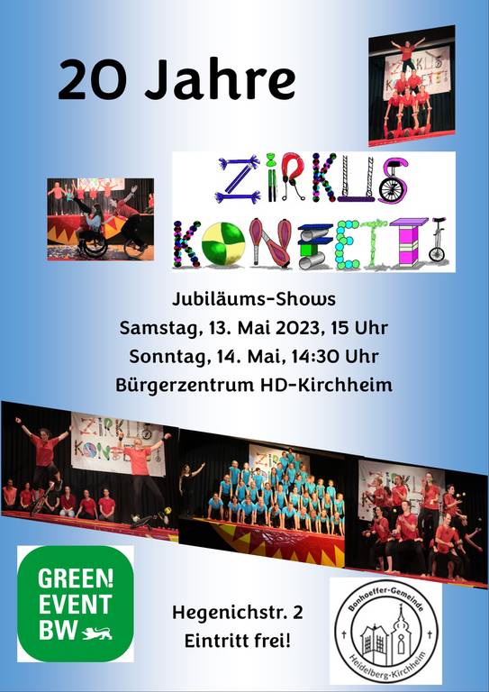 Heidelberg, 13./14.05.2023. Zirkus Konfetti in HD-Kirchheim wird 20 Jahre! Zwei Shows des Kinder- und Jugend-Zirkus Konfetti der Bonhoeffer-Gemeinde wurden Samstag und Sonntag im bis auf den letzten Platz gefüllten Bürgerzentrum Kirchheim präsentiert. Am Samstag, den 13. Mai, hat der Zirkus Konfetti zusammen mit seinen Gästen vom Zirkus Paletti, vom Zirkus Markini, vom Circus Peperoni, vom Zirkus Prisma, vom Circus Esperanza und vom Circus Odini eine abwechlungsreiche Show gezeigt mit Kugel laufen, Trapez, Vertikaltuch, Akrobatik, Einrad, Poi und vielem mehr.