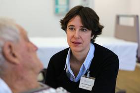 Klinikseelsorgerin Sabine Hannak im Gespräch mit einem Patienten