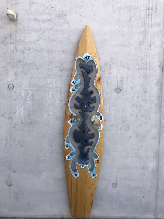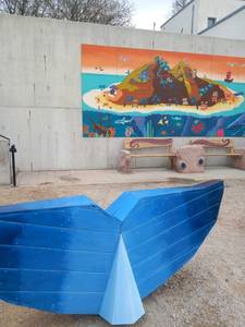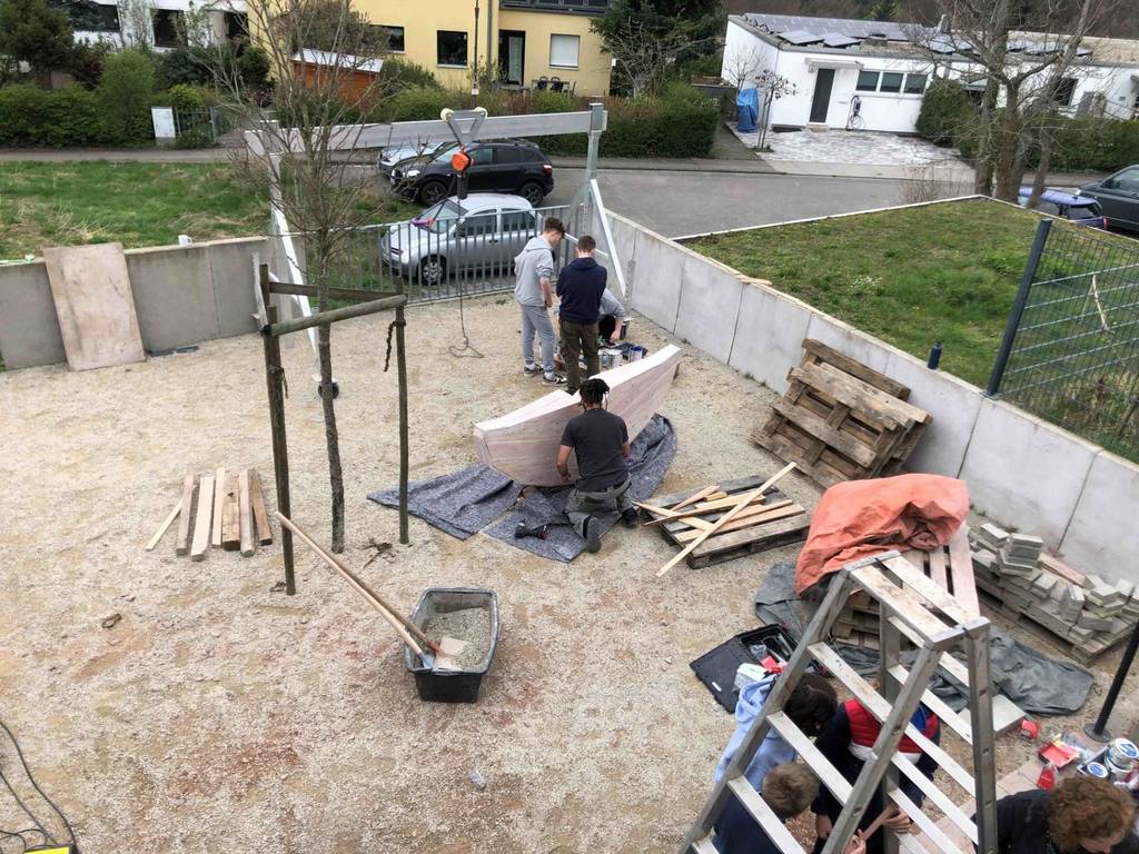 Professionell angeleitet in den unterschiedlichen Gewerken von Pädagog*innen der Werkstattschule konnten die Jugendlichen ihre handwerklichen und kreativen Fähigkeiten erproben. Es entstanden verschiedene Gestaltungselemente aus Holz und Buntsandstein für den Bouleplatz hinterm Gemeindezentrum sowie ein großes Wandbild auf Faserzementplatten. Eine große Sitzbank lädt nun zum Ausruhen ein, ein festinstalliertes Zählbrett soll allen, die dort eine Partie Boule wagen, helfen, die Punkte im Blick zu behalten. Das Wandbild und eine Skulptur aus Holz verschönern nun die Rückansicht des Gemeindezentrums. Als motivgebendes Thema hatten die Jugendlichen sich das Thema Meer gewählt – eine Assoziation zum Boule-Spiel am Strand. So entstanden eine Walflosse, ein Oktopus und ein Surfbrett. Das Wandbild der Gestaltungsgruppe erzählt von zwei Welten, die nichts voneinander wissen, und doch nah aneinandergrenzen: Über- und Unterwasserwelt.