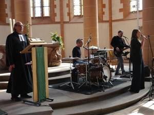 In der Heiliggeistkirche ging es am Sonntag aber nicht darum, Fans mit einem kostenlosen Cover-Konzert zu erfreuen. Das Besondere an den Pop-Gottesdiensten ist nach wie vor die Verbindung von zeitgenössischer Musik bekannter Stars mit christlich-religiösen Inhalten innerhalb eines Gottesdienstes. Das Ziel ist es, Menschen mit der Botschaft der Kirche zu erreichen, die sich von den klassischen Formaten nicht angesprochen fühlen. Die Gottesdienstbesucherinnen und Gottesdienstbesucher kamen zum Teil von weit her, um diese besondere Form, sich mit christlichen Inhalten auseinanderzusetzen, zu erleben. Eine Dreiergruppe aus Eschelbronn mittleren Alters schätzt schon länger die neuen Formate, eine ganze Gruppe von Jugendlichen war auf Einladung des Großvaters vor Ort und auch zwei Ministrantinnen einer katholischen Gemeinde aus dem Umland waren extra gekommen: „Wir waren schon öfter hier und finden die andere Art Gottesdienst toll, die gibt es bei uns nicht. Taylor-Swift-Fans sind wir natürlich auch.“