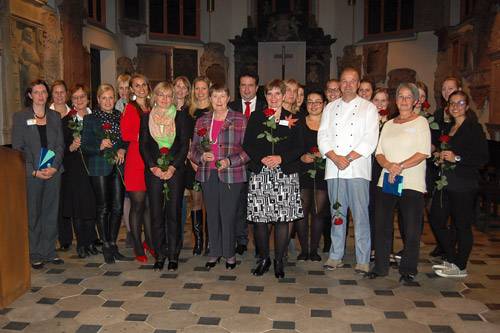 Heidelberg. 27.10.2013. (tri) Das evangelische Dekanat Heidelberg, die Universitätsgemeinde Heidelberg sowie die evangelischen Frauen in Baden veranstalteten das erste Heidelberger Frauenmahl in der von Kerzen beleuchteten Peterskirche. Die langen Tische waren festlich eingedeckt und wunderschön herbstlich dekoriert. Das vegetarische Viergangmenü aus regionaler Küche mit herbstlichen Blattsalaten, Grünkerncreme, Zucchini-Auberginen-Roulade sowie Variationen von der Zwetschge und guten Weinen schmeckte den rund 100 Frauen aus der Metropolregion vorzüglich. Dazwischen lockerten die Tischreden von Expertinnen aus Kirche, Kunst und Politik beim Heidelberger Frauenmahl den geselligen Abend auf. Und diese Tisch waren überaus gehaltvoll. Dekanin Marlene Schwöbel-Hug begrüßte die Festgäste, Grußworte sprach auch Margit Fleckenstein, Synodalpräsidentin der Landeskirche. Danach beeindruckten Pastorin Aleida Siller, Dr. Brigitte Spielmann, Syndikusanwältin der Weldebräu, Dr. Annette Maleika, Chefärztin Gynäkologie Schwetzingen, Jagoda Marinić, Leiterin des Interkulturellen Zentrums Heidelberg, Nanine Linning, Künstlerische Leiterin am Theater Heidelberg sowie Prof. Dr. Anke Schuster (Stadträtin der SPD) zwischen den Menügängen mit ihren Visionen zur Zukunft von Religion, Kirche und Gesellschaft. “In wunderbarer Atmosphäre gab es Diskussionen in den Reihen der Frauen, der Austausch untereinander war doch so wichtig in einer Zeit der Umbrüche und Krisen sowie der Auseinandersetzung mit der Frage: Welche Impulse können da Frauen setzen?“, betont Dekanin Dr. Marlene Schwöbel-Hug. Das Salon-Duo „Belle Epoque“ mit Jutta Steyer am Klavier und Jochen Steyer an der Violine wird für musikalische Genüsse beitragen. „Bei diesem stilvollen Essen und gehaltvollen Reden konnten sich die Frauen kennenlernen, viele Anregungen erhalten und sich rundum bedienen lassen, in einer netten Atmosphäre“, erklärte Anke Ruth-Klumbies, Leiterin der Evangelischen Frauen in Baden, dieden Abend moderierte und möglichst Frauenmahle in vielen evangelischen Bezirken durchführen möchte. In ganz Deutschland werden im Rahmen der Reformationsdekade bis 2017 Frauenmahle innerhalb der EKD organisiert. Die sogenannten Tischreden, die das „Herzstück“ der Frauenmahle darstellen, lehnen sich an Martin Luther an, dem es so gelang, Theologie und Alltag überzeugend zusammenzubringen. Diese Redeweise haben die Evangelischen Frauen für die Frauenmahle neu belebt.