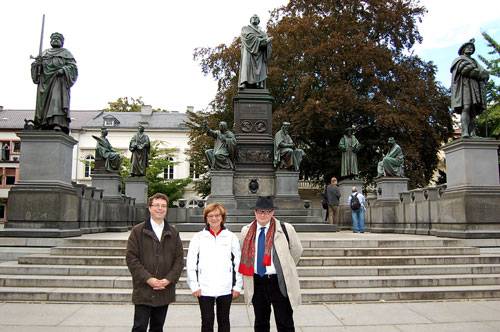 29.9.2013. Am „europäischen Tag der jüdischen Kultur“, der in diesem Jahr am letzten Sonntag im September stattfand, besuchte eine Delegation der jüdischen Kultusgemeinde Heidelberg sowie der evangelischen und katholischen Kirche in Heidelberg das jüdische und christliche Worms. Seit Jahren bestehen innerhalb eines interreligiösen Dialogs bereits enge Beziehungen, ja sogar Freundschaften in den Gemeinden. So machten sich rund 40 Teilnehmer auf die Spuren der mittelalterlichen Stadt am Rhein, die aufgrund ihrer jüdischen Geschichte auch als „Klein-Jerusalem“ bekannt ist. „Ich begrüße Sie alle recht herzlich zu unserem gemeinsamen Ausflug, bei dem wir uns noch näher kennenlernen wollen, und dieser Ausflug, so habe ich es erst bei einem Treffen der EKD von Kollegen aus unseren Landeskirchen vernommen, ist eine sicher einmalige und daher auch für andere Gemeinden vorbildliche Veranstaltung“, sagte Dekanin Dr. Marlene Schwöbel-Hug. Vor der Synagoge empfing Sandra Wilhelm die Gruppe und führte durch das jüdische Gotteshaus und in dessen Geschichte ein. Synagoge bedeutet Versammlungsraum. Sie wurde in Worms ursprünglich im Mittelalter um 1034 erbaut und zuletzt in der Reichspogromnacht völlig zerstört. Das jüdische Gotteshaus im romanisch/gotischen Stil konnte 1961 au falten Mauerresten wiederaufgebaut werden. Rabbiner J. Pawelczyk-Kissin übersetzte die Ausführungen der Gästeführerin auch in die russische Sprache und ließ die jüdische Religion durch seine lebhaften Schilderungen noch anschaulicher werden. „Wir haben in Heidelberg rund 470 jüdische Gemeindeglieder“, erklärte der Rabbiner. Im Vergleich hierzu: Bis 1933 wohnten in Worms 1100 Juden, jetzt gibt es keine eigene Gemeinde in der ehemaligen Kaiserresidenz mehr, lediglich fünf jüdische Familien sind hier noch sesshaft. Außerdem konnten das Ritualbad - die “Mikwe“ -, die Judengasse und der älteste jüdische Friedhof Europas besichtigt werden. Sehr beeindruckend gestaltete sich der Besuch der alten und der neuen Jüdischen Friedhofsanlage „Heiliger Sand“ mit rund 2000 Gräbern, der älteste Grabstein stammt von 1058. Aber natürlich beeindruckte auch das größte Lutherdenkmal auf der ganzen Welt, erbaut 1868. Die Figuren, darunter die „Protestierende von Speyer“ (Protestanten) zeigen die Reformationsgeschichte und das stattliche Denkmal Luthers, als er im Reichstag zu Worms vor Kaiser Karl V. seine Thesen von 1517 widerrufen sollte. Doch Luther beharrte darauf: „Hier stehe ich, ich kann nicht anders, Gott helfe mir, Amen“. Was letztlich die Reformation einleitete. Eine Führung durch den katholischen Dom St. Peter, erbaut im 12. Jahrhundert, mit Domführer Karl Maar schloss sich an. Am Dom finden am sogenannten Kaiserportal auf der Nordseite die jährlichen Nibelungenfestspiele statt. Dekan Dr. Joachim Dauer von der katholischen Kirche konnte hier noch ergänzende Ausführungen für die Besuchergruppe geben. Beim Abschied gab es herzliche Umarmungen und das Versprechen, noch enger in Kontakt zu bleiben. Angedacht ist, im nächsten Jahr wieder gemeinsam einen Ausflug von Heidelberg aus an einen historischen Ort mit bedeutender jüdischer und christlicher Kultur zu unternehmen.