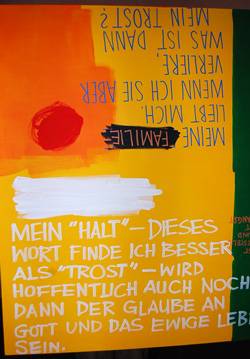 Die künstlerische Umsetzung einiger Textzeugnisse hat Alexander Linn, Kunstlehrer am Helmholtzgymnasium Heidelberg gemeinsam mit Schülerinnen und Schülern des Abitursjahrganges 2013 übernommen. Der Umgang mit den Texten ist nicht illustrativ, will vielmehr die Sprache direkt zum Material und zum Motiv von Malerei werden lassen. Vorbilder und Wegweiser für diesen künstlerischen Umgang mit dem geschrieben Wort sind Paul Klee und Picasso, aber auch die die Dadaisten. Bei den Leinwänden von Alexander Linn finden sich aber die direktesten Bezüge zum Werk der amerikanischen Nonne und Künstlerin Corita Kent (1918-1986). In zahlreichen workshops hat sie ihre spezifische Form hat Sister Corita ihren Umgang mit Schrift gestaltet und weitergegeben. Ihre Impulse hallen noch heute in der malerischen Avantgarde Amerikas nach.