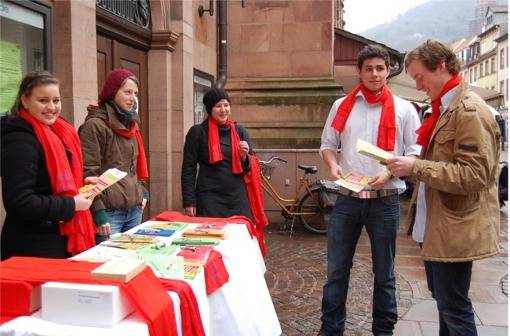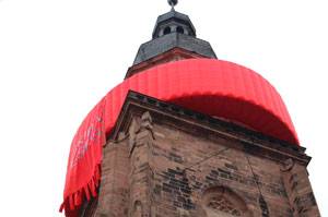 Heidelberg, 11.02.2011. Mit einer spektakulären Aktion und starker Symbolkraft hat die Evangelische Landeskirche in Baden (EkiBa) ihre Klimaschutzkampagne gestartet: In schwindelnder Höhe blies die Spezialfirma Public Activ aus Hamburg eine 130 Kilogramm schwere, knallrote Plane am Turm der Heiliggeistkirche mit Luft auf. Nach anfänglichen Schwierigkeiten formte sich der riesige Stoffballen allmählich zu einem 40 Meter langen, fünf Meter hohen und einen Meter dicken ‚Schal’. Diese ungewöhnliche Aktion sorgte vier Tage lang für großes Aufsehen. Und das war durchaus gewollt. Die neugierig gewordenen Menschen konnten sich an Ständen vor und in der Heiliggeistkirche über den Hintergrund dieser Aktion informieren und sich ein Bild von der Klimaschutz-Initiative der badischen Landeskirche machen. In der Hauptstraße zog derweil auch der Schülerchor des Thadden-Gymnasiums mit seinem Gesang viel Aufmerksamkeit auf sich und informierte die Passanten. Der Stoff für den ‚Schal’ wurde nach dem Einsatz am Turm der Heiliggeistkirche in den Diakonischen Werkstätten Mosbach zu Taschen weiterverarbeitet.