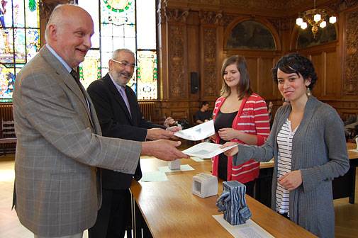 Heidelberg, 4. Mai 2011. Es ist geteilte, aber keineswegs ungebrochene Freude, die sich im Rathaussaal breitmacht. Einerseits ist da die Freude über den Gewinn einer Reise nach Gurs in Frankreich, andererseits die Erinnerung an eine grauenvolle Vergangenheit. Anna-Sophy Weßling und Elisa Huynh gelingt kein „Siegerlachen“ fürs Foto, sondern lediglich ein verhaltenes Lächeln. Beide Schülerinnen (sowie Katharina Jungwirth) erhielten für ihre künstlerischen Mahnmalentwürfe als Anerkennung für ihr herausragendes Engagement zum Thema „Aufarbeitung der Deportation der badischen Juden“ Dankesurkunden von Bürgermeister Wolfgang Erichson. Er lud die Schülerinnen zu einem mehrtägigen Aufenthalt im nächsten Jahr nach Gurs ein.