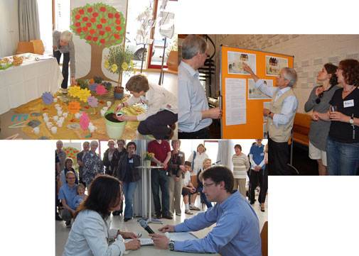 In der ersten gemeinsamen Ausstellung dieser Art zeigten 20 Pfarrgemeinden als kooperierende ‚Pärchen’ ihre Profile und Stärken mit kreativen Ideen, aber auch Schwierigkeiten beim Zusammenwachsen auf. Da war beispielsweise der „Auszug des Volkes Israel aus Ägypten“ zu sehen, den die Pfarrgemeinden Boxberg und Emmertsgrund eindrucksvoll als „Heimatabenteuer“ darstellten. Ein Fahrrad, eine braune Decke als Wüstensand, ungesäuertes Brot und Wasser symbolisierten den Aufbruch zur Fusion, die im Juni dieses Jahres besiegelt sein soll. (Foto) Auch Rohrbach-West und -Ost wachsen zusammen. An einem Apfelbaum waren die reifen Früchte der bisherigen Arbeit, an einem Zitronenbäumchen aber die Mühen und Stolpersteine des Zusammenwachsens beider Pfarrgemeinden zu sehen. Doch gab es hier auch den „Becher Hoffnung“ mit fruchtbarer Erde und Kressesamen für jeden Standbesucher, denn dieser Samen sprießt schnell zum gesunden Pflänzchen. An aktuellen Fotos zeigten Kirchenälteste der Friedensgemeinde begeistert das Umbau- und Renovierungskonzept ihrer Kirche und betonten, dass die Befürworter der umstrittenen Stufenanlage in der Gemeinde in der Überzahl seien. Nach Konzerten auf der probeweise eingebauten Stufenanlage sei man der Überzeugung, dass sie vor allem für die Verkündigung von Wort und Musik eine Einheit sei und ideale Möglichkeiten für Chöre biete. Bunte buttons mit Herz verkündeten „I love Jugendarbeit“, eine nette Idee des evangelischen Kinder- und Jugendwerkes, die sich jeder gern anheftete.