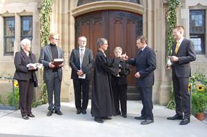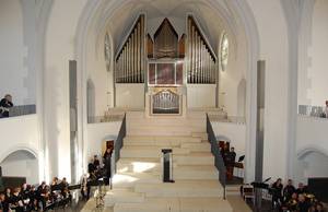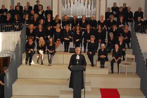 Heidelberg-Handschuhsheim, 30.9.2012. In die über einhundertjährige Friedenskirche ist wieder Leben eingezogen. Gebet und Musik. Wie auf einer Himmelsleiter stehend, präsentierten sich Kirchenchor, Jugendkantorei „Kurrende“ und die Kantorei auf der breiten Stufenanlage bei der Wiedereinweihung durch Landesbischof Dr. Ulrich Fischer. Die einmalige Akustik im Kirchenschiff erhob die Stimmen zum Engelsgesang. Das Resultat der zweijährigen Innenrenovierung, so bekräftigten viele Besucher nach dem Festgottesdienst, sei durchweg positiv: „Unsere Kirche strahlt jetzt so hell, auch die Stufenanlage für die Chöre gefällt uns, das sieht doch beeindruckend aus“, hörte man gerade auch von älteren Gemeindegliedern.